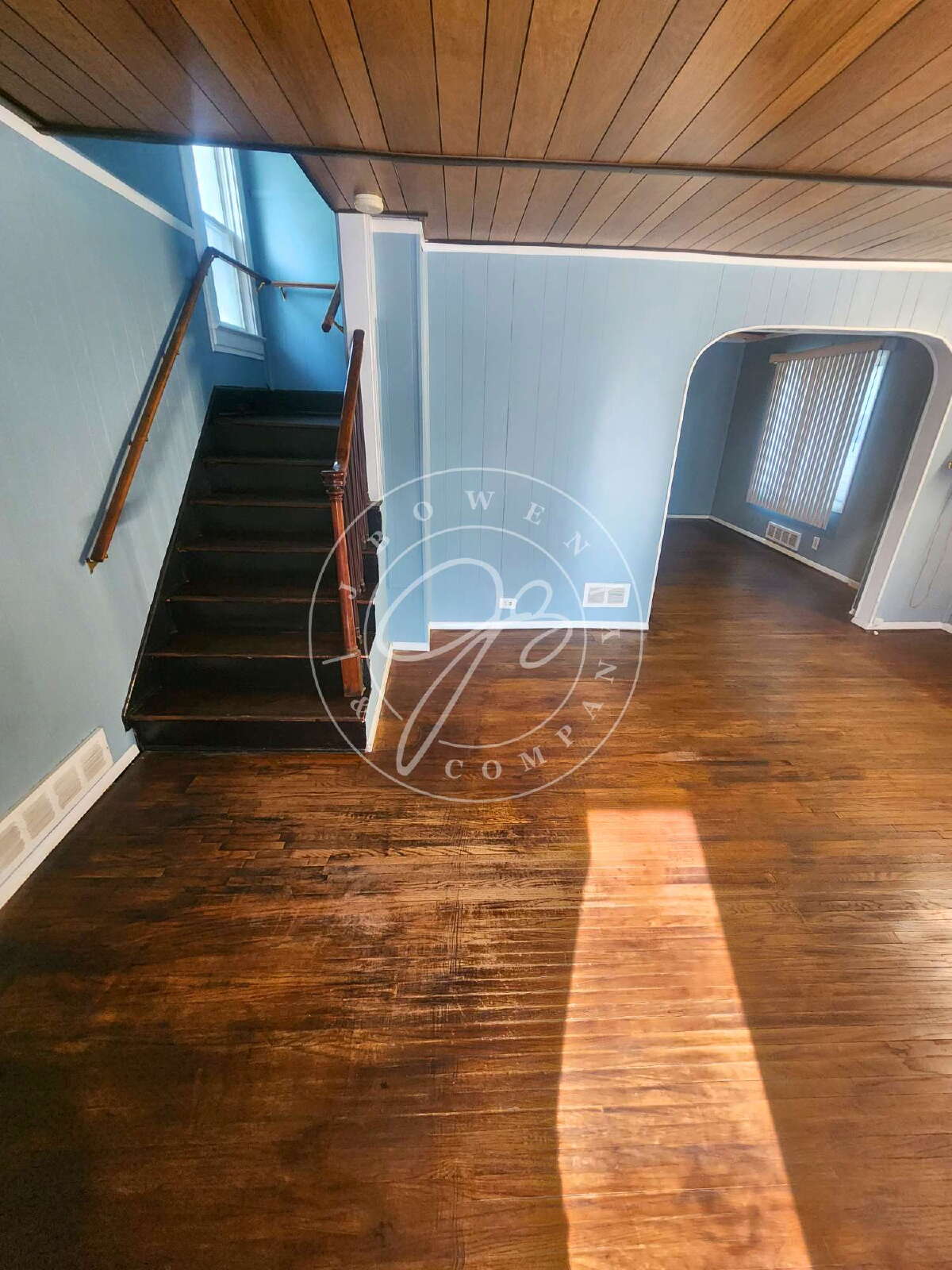 Must see to appreciate this 2 story 2 bedroom home. Featuring a spacious living room with new vinyl plank flooring and freshly painted. Spacious dining room with wall unit A/C and ceiling fan off kitchen/living room. Kitchen includes stove and refrigerator. 2nd floor has two spacious bedrooms and full bathroom. Unfinished basement. Situated on large lot with fenced in backyard.