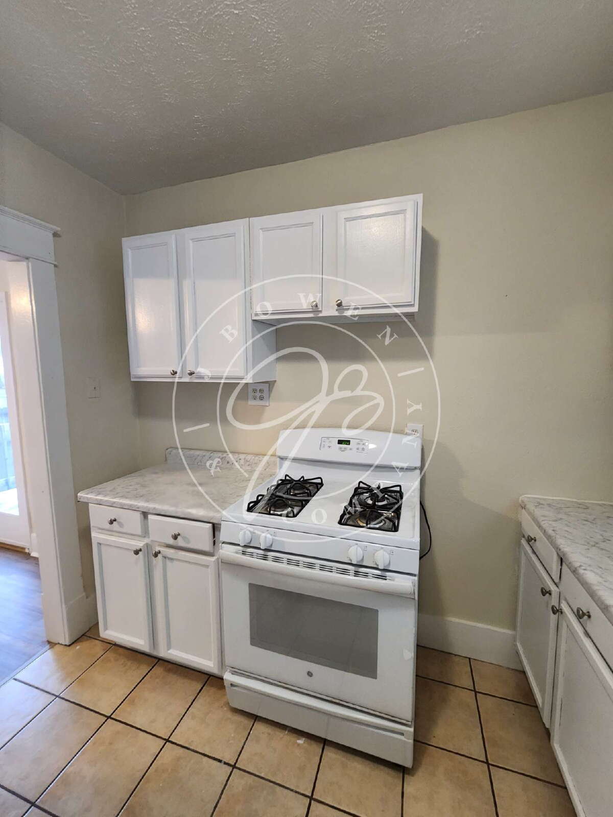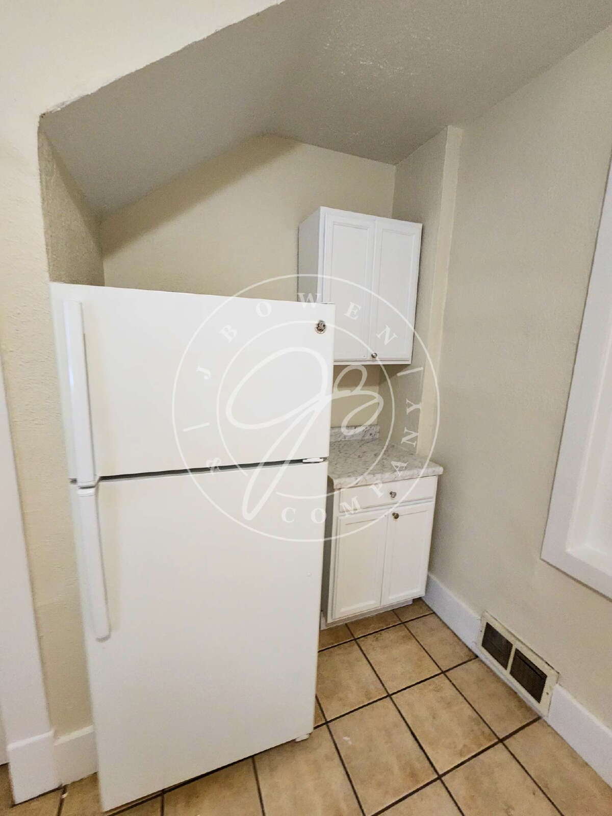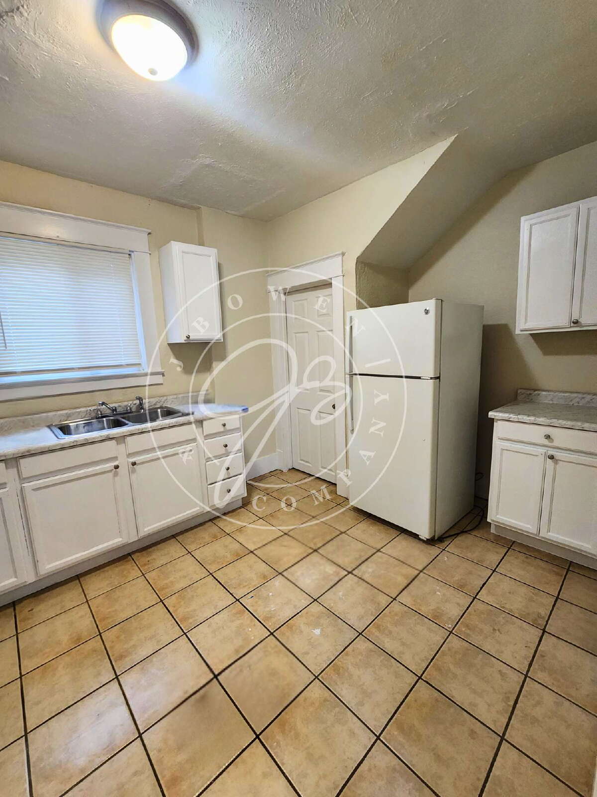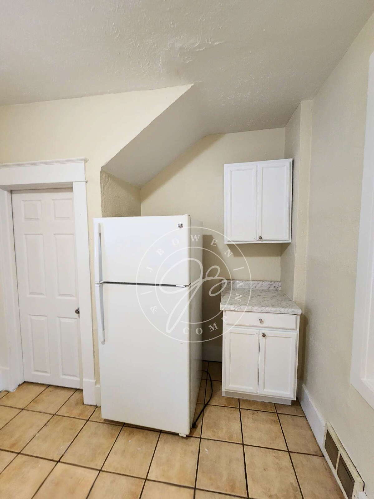 The spacious kitchen comes equipped with a stove and refrigerator, along with ample cabinet space. Laundry hookups are conveniently located in the full, unfinished basement, which also provides additional storage.