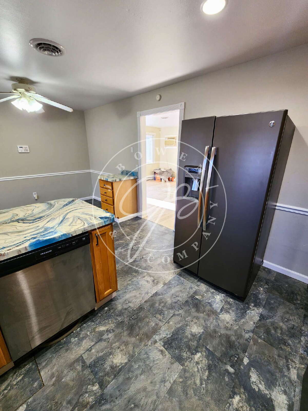 Inside, you’ll find a freshly painted living room with brand-new vinyl plank flooring, vertical blinds, and an abundance of natural light. The oversized kitchen and dining combo features a custom countertop design and comes equipped with a stove, refrigerator, dishwasher, and microwave, plus a bonus refrigerator located in the basement bar area.